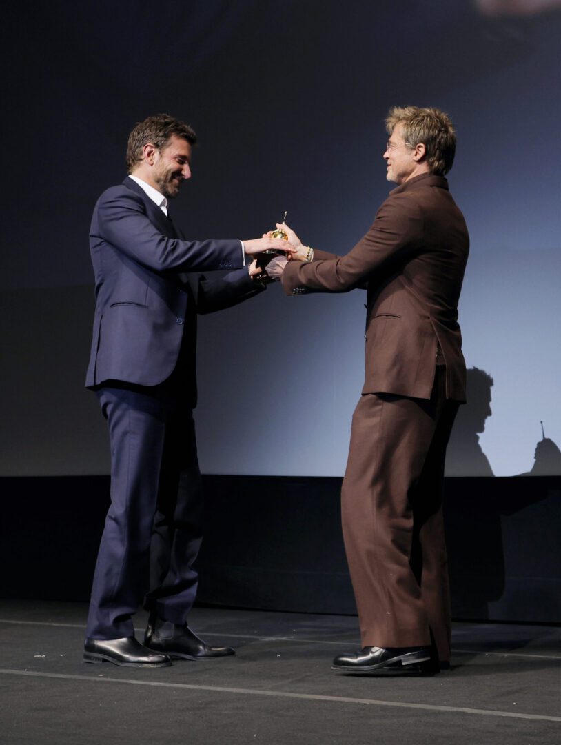 SANTA BARBARA, CALIFORNIA – FEBRUARY 08: Brad Pitt (R) presents Bradley Cooper with the Outstanding Performer of the Year Award at the 39th Annual Santa Barbara International Film Festival at The Arlington Theatre on February 08, 2024 in Santa Barbara, California. (Photo by Tibrina Hobson/Getty Images for SBIFF)