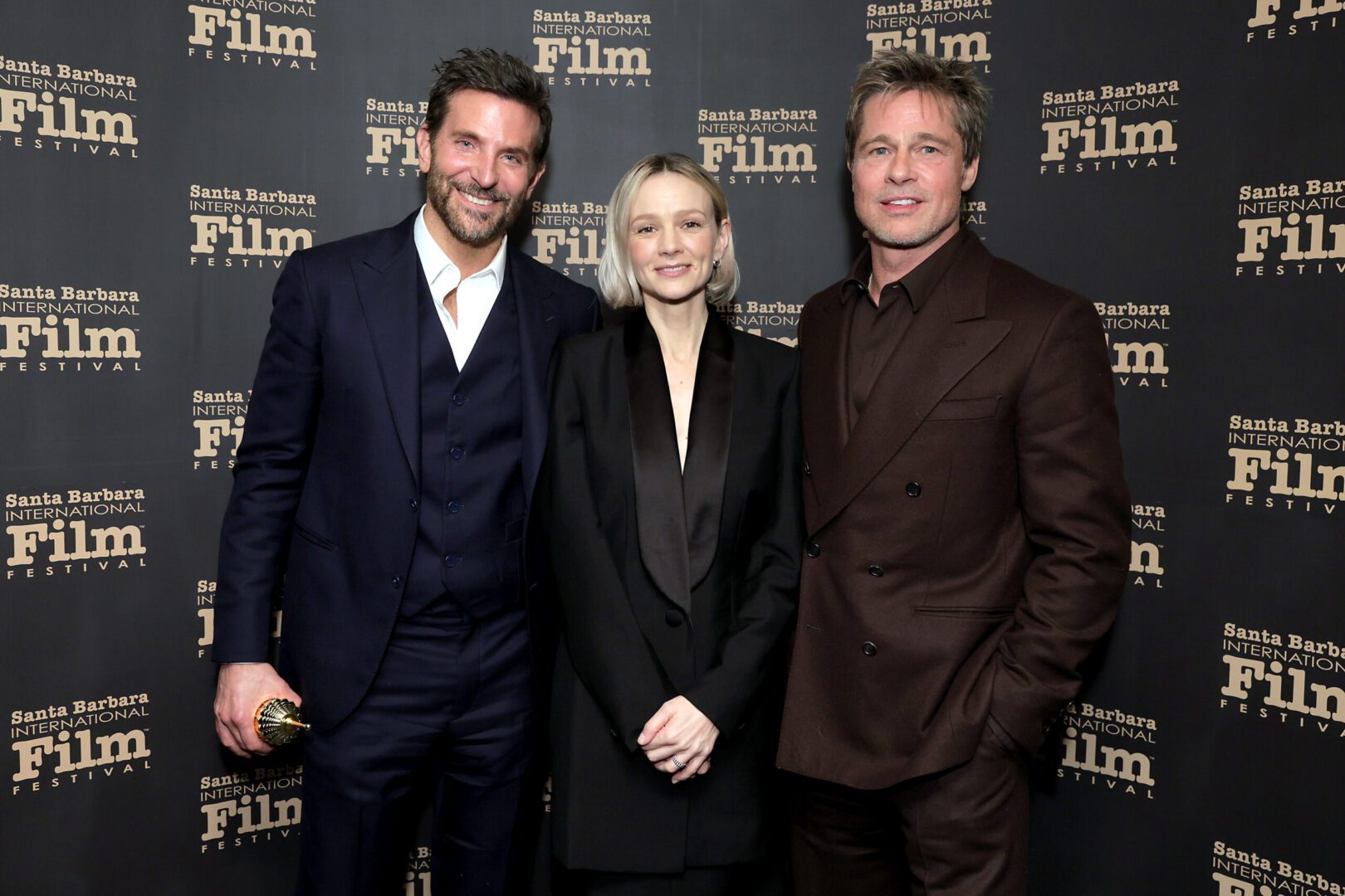 SANTA BARBARA, CALIFORNIA – FEBRUARY 08: (L-R) Honoree Bradley Cooper, Carey Mulligan, and Brad Pitt pose with the Outstanding Performer of the Year Award during the 39th Annual Santa Barbara International Film Festival at The Arlington Theatre on February 08, 2024 in Santa Barbara, California. (Photo by Rebecca Sapp/Getty Images for SBIFF)