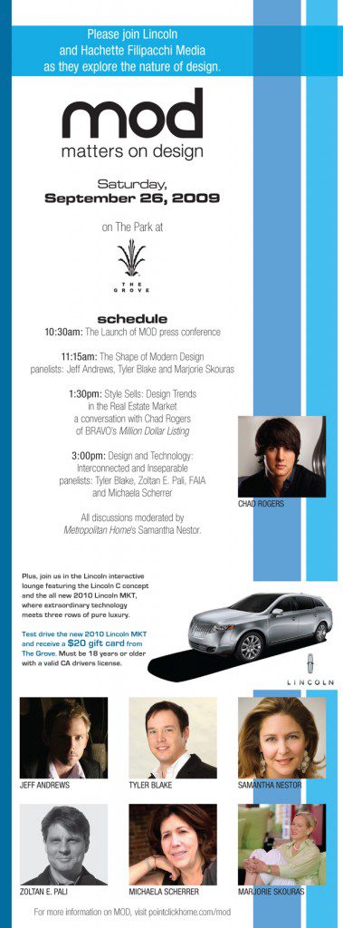 For all of you in LA who are interested in design-in fashion, interiors, vehicles, art instillations, and more-come join me at MOD (Matters on Design) this Saturday at the The Grove on Fairfax for a day dedicated to your favorite subject. It kicks off at 10:30 AM with a MOD press conference, followed by panels hosted by Chad Rogers wonder boy realtor from Bravo TV’s Million Dollar Listing and moderated by Metropolitan Home’s Samantha Nestor. Panelists include various experts from the world of design: Jeff Andrews, Tyler Blake, Zoltan E. Pali, FAIA, and Michaela Scherrer. Also, this day of design has the Lincoln interactive lounge featuring the Lincoln C concept and the new 2010 Lincoln MKT, which if you test drive (some rules apply), you will receive a $20 gift card from The Grove. Who doesn’t want that? This program is produced by A-List Communications, The Grove, Elle Decor, and Metropolitan Home. There will also be a private party in the evening hosted by the beautiful Ali Landry.