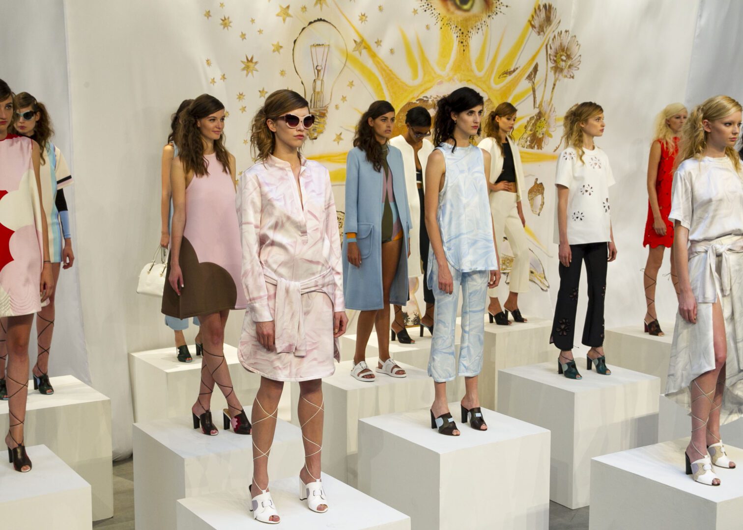 Models posed atop white blocks presenting a fresh and clean line full of bold prints and pops of color. The active wear inspired collection was made up of tunics, flared pants, trapeze dresses, and full on sportswear pieces.