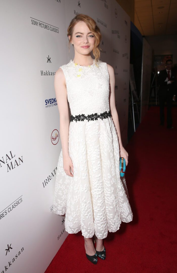 Emma Stone looked like LWD perfection at Woody Allen’s Irrational Man premiere at the Writer’s Guild Theater in Beverly Hills last night. The event was hosted by Svedka, Hakkasan and Sabra Hummus. And Emma rocked a white embroidered Giambattista Valli number, complemented by turquoise Jennifer Meyer studs, Paul Andrew floral-print ankle-strap heels and a blue box clutch. Love! Are you a fan?