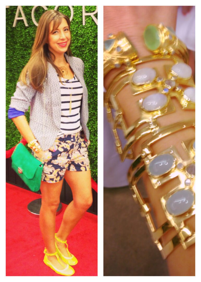 Typically, I don’t wear a lot of prints. But when I saw all of the gorgeous LOFT floral pieces and nautical stripes, I knew that I would be in pattern-heaven! And after some styling, I soon discovered that they made such a fun statement when put together in one ensemble. And to carry on with that bold theme, I accessorized with stunning Julie Voss moonstone bracelets stacked up my arm, a bright green Lauren Merkin crossbody bag and neon yellow and gold-studded Yosi Samra T-strap flats. And did I mention that I was playing in $1,000,000 dollars worth of Tacori fine jewels? That didn’t hurt either!