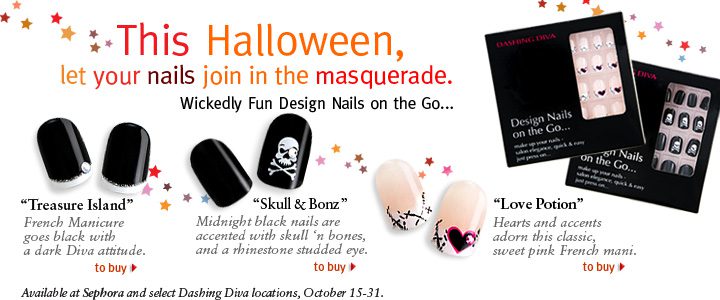 Remember the Lee Press On Nails from the 1980’s? Every Valley Girl from Encino to the Hudson donned them in oh so alluring shades from hot pink to raven red. Easy on…easy off. Well nowadays you can get that same convenience from Dashing Diva’s line of instant nails-just in time for Halloween. Designs like “Skull & Bonz” for your sexiest pirate get up and “Love Potion” if you are feeling a little Elvira-y, these adornments will surely complete a sassy costume. The good news is they are only $8 per set, so you could even change up your costume if your are feeling it.