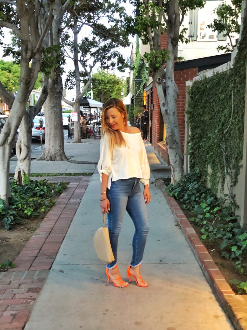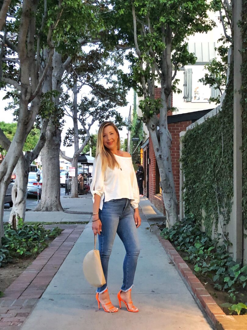 I am such a jeans girl. I love wearing them with sneakers and a cardi for a dressed-down, on-the-go look. But I also like wearing them more elevated with a sexy heel, cute top, and fun accessories. And this look in particular is so wearable! Jeans are just so easy for this busy, working Mom. What is your most worn closet staple?