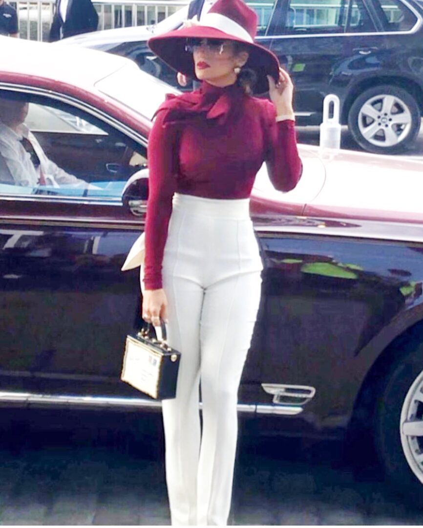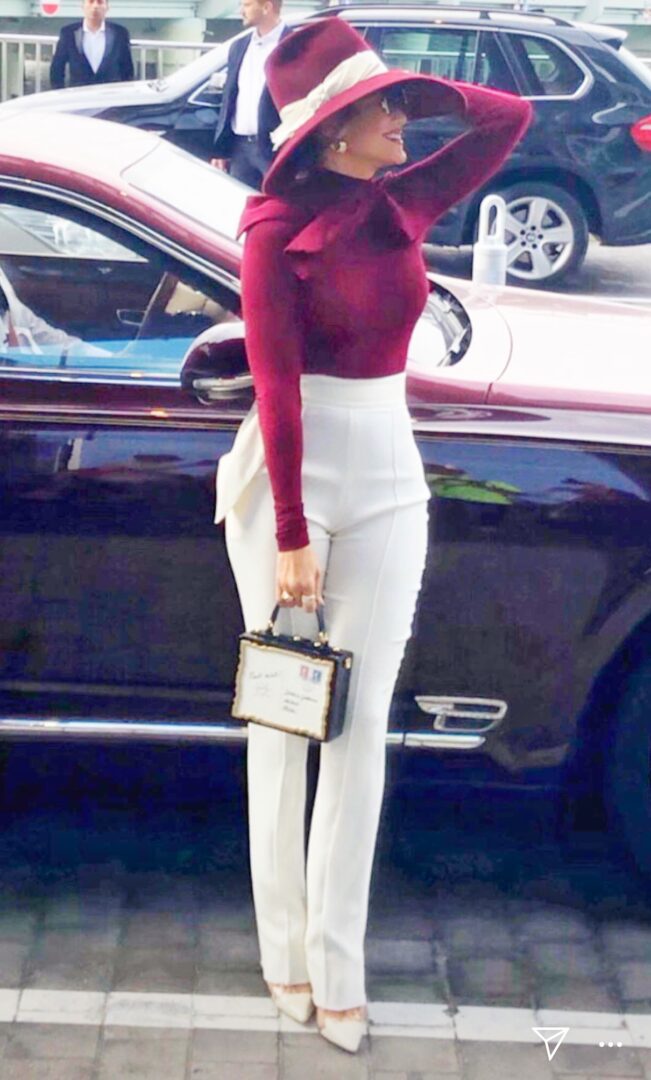 Jennifer Lopez just completed a whirlwind trip to Qatar for the Doha Festival City grand opening. And her fashion didn’t disappoint. In my favorite look of her trip, she looked so chic and so sophisticated. She sported this magenta bow-tie sweater with a matching wide-brim hat and slim white trousers. She completed her look with white and lucite pointy-toe heels, a black and white letter-design purse, sunnies, and a bold red lip. Love this ensemble! How about you?