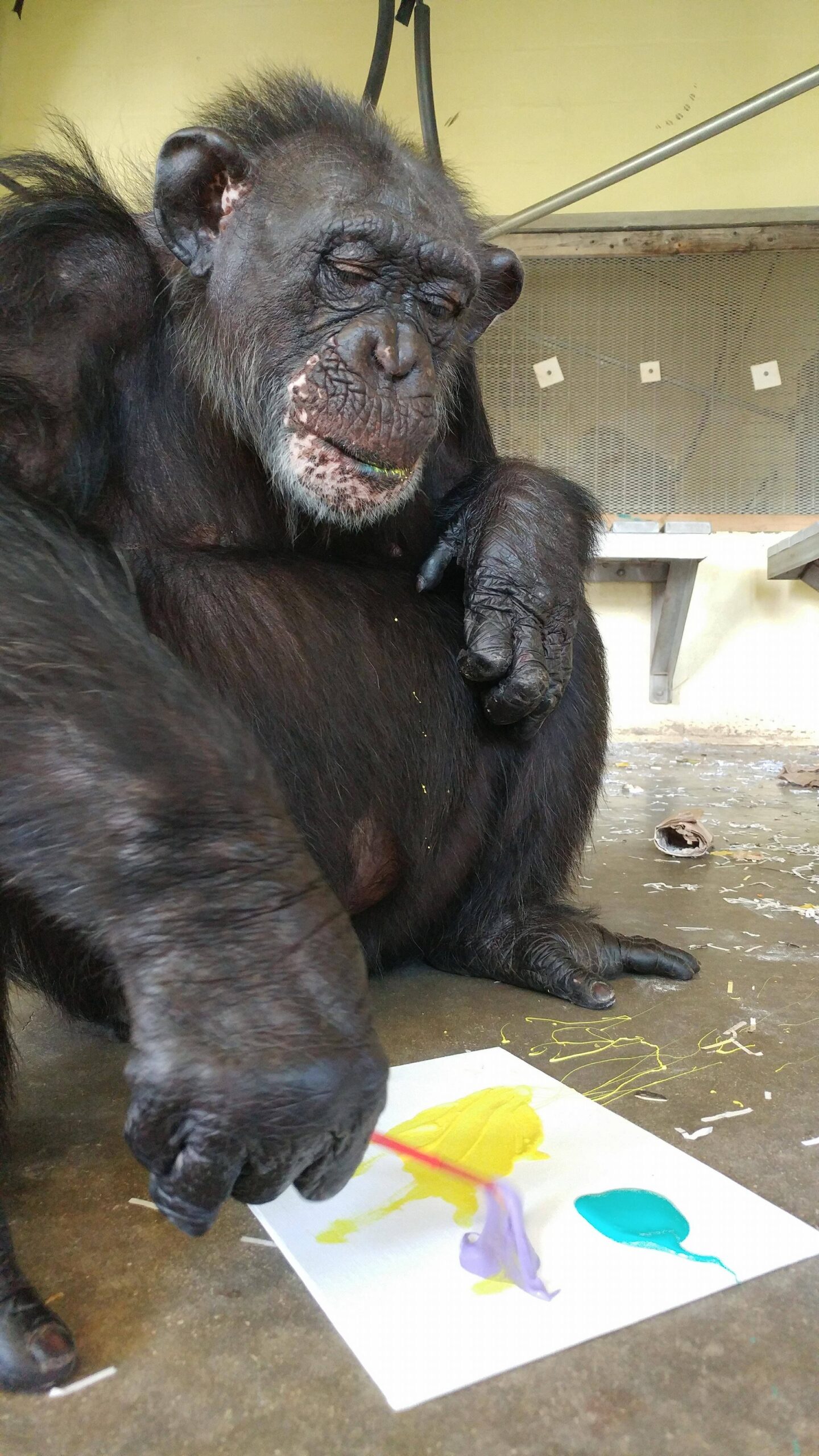“The purchase price not only gets you one of just 16 signed paintings by Hollywood’s coolest couple, but an invitation to the private sanctuary to meet some of the ape artists who collaborated with them,” says Dan Mathews, Director of Events & Special Projects at Save the Chimps.