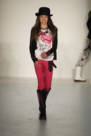 The evening show had a very rock n roll feel as Avril Lavigne presented her Abbey Dawn collection. In fact, the end of the runway was roped off in order to create a mosh pit feel. As her tunes blared over the speakers including “Sk8tr Boy,” tweens and teens charged down the catwalk in colored hoodies and top , patterned leggings, and lots of layers complemented by combat boots. At the end of the show, Avril cruised down the catwalk in a black 80’s goth-strapless bustier, tulle skirt a la Like A Virgin, and sky high stilettos.