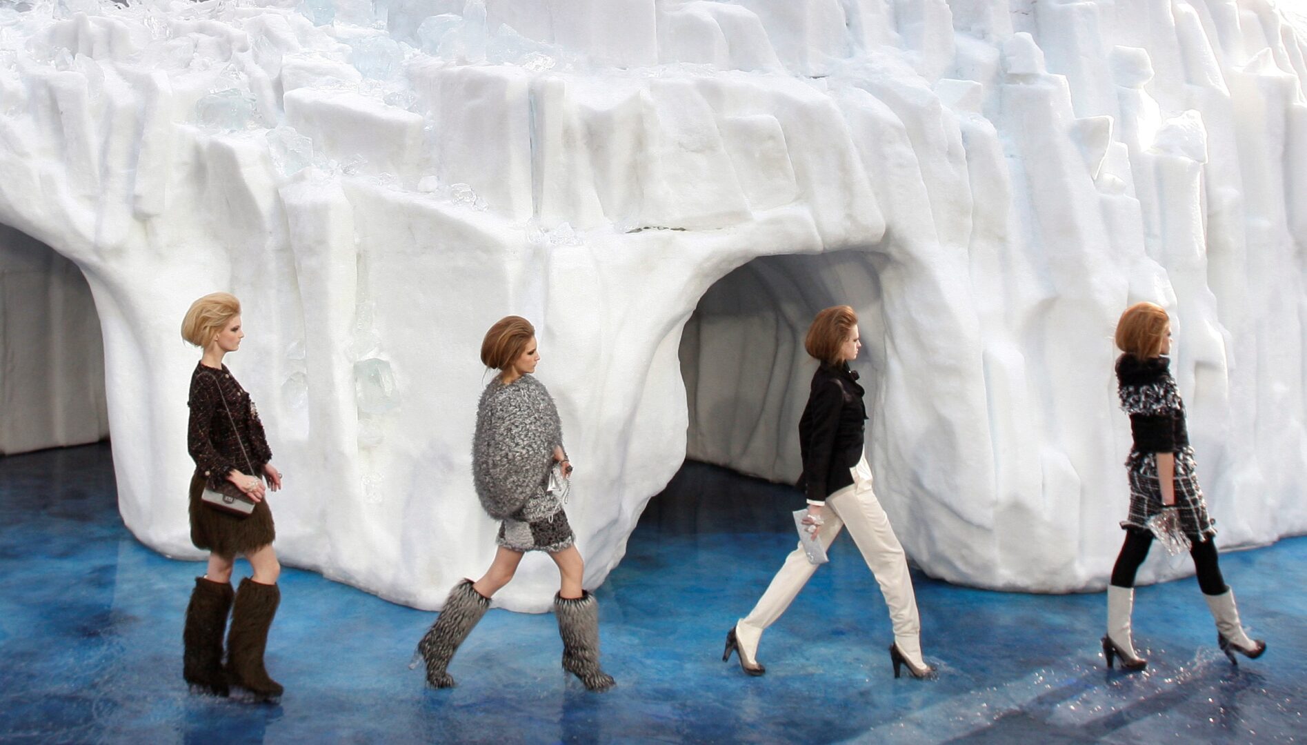 Chanel Fall 2010 debuted this week at the Grand Palais in Paris to a chilly reception-and not by the audience. You see, the presentation’s backdrop was an iceberg complete with a centimeter high of water. And the models were wearing FAUX fur boots on top of it! Yay! If Karl Lagerfeld is showing faux fur, you know it is hot for the Fall. Just not sure how we are going to maneuver those icebergs?