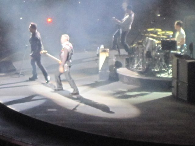 It is hard to find fault with U2-they consistently prove their worth time and time again through their passion driven music, high energy, and willingness to go the extra mile to wow and inspire the audience. This was definitely the case last night after English band Muse, who complemented the U2 sound with their own rocking set, opened for them at Cowboys Stadium in Arlington, which was a venue (that not only cost over $1 billion to construct but also has state of the art technology like 60 yard high def. plasma screens hanging from the ceiling and a truffle mac and cheese bar for the foodies out there) the only a few bands could fill with their sounds while creating an intimate experience courtesy of the poetic proselytizing of Bono and the obvious syncopation and closeness that these guys have with one another after a few decades together. Of course, Bono got the hometown crowd (70,000 +) stirred up with his mentions of “Fort Worth!”, “Richardson!”, and “Fair Park!” as well as calling out to Tony Romo and the Dallas Cowboys, who happened to be in the audience. Always the humanitarian, he also emphasized a “non-violent revolution” and recognized the imprisoned Burmese pro-democratic leader Aung San Suu Kyi during “Walk On” which he has done and will continue to do every night of the 360 Tour. Fans around me were visibly moved by this and even shed a few tears.