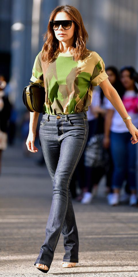 I love a really good, effortless street style look. And Victoria Beckham has dominated it this week. She sported this camouflage t-shirt, jeans from her collection, dark sunnies, and black/gold clutch, which looked amazing with her ensemble.