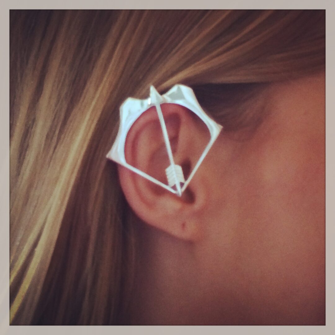 The Capitol Couture Collection features very wearable looks, such a leather pants that recall Cinna’s rocker style, a laser cut dress modeled after Katniss’ chariot costume and an ear cuff with an arrow through the middle that I am totally obsessed with!