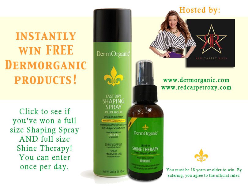 I am super-excited to host this amazing beauty giveaway with DermOrganic in which you can win a full size Shaping Spray and Shine Therapy, perfect to help tame your mane! And all of DermOrganic’s products are vegan, cruelty-free, are without sulfates or gluten and are pH-balanced. Try your luck to see if you’re an instant winner! Start by liking both the Red Carpet Roxy and DermOrganic Facebook pages. You may enter once per day. Instant win game ends when supplies run out or 12/17/13 at midnight PST – whichever comes first. You must be 18 or older. US residents only. Click here to enter. Good luck!